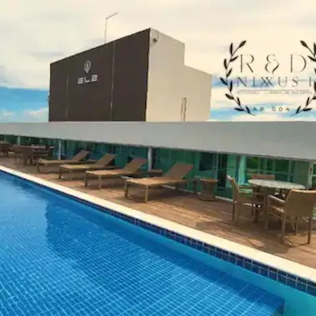寝室1室のNixxus - Studio Com Exclusiva Piscina Privativa Na Varanda - A Poucos Minutos Da Praia E Do Centrinho De Pôrto das Galinhasはヒポキャンパス プロジェクトから徒歩で10分くらいです。 テラスを提供する海辺の29m²のアパートは市内の中心に位置しています。